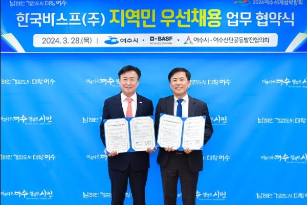 시에 따르면 지난 28일 오후 시장실에서 여수시와 한국바스프(주)가 ‘여수산단 지역민 우선채용’ 협약을 체결했다.