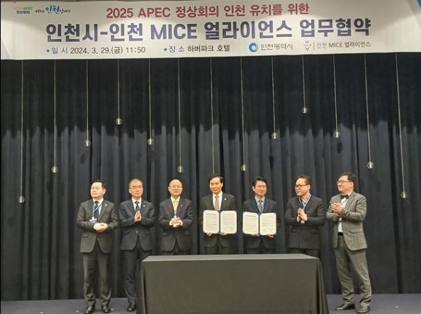 인천광역시는 3월 29일 하버파크호텔에서 인천 마이스 얼라이언스와 2025 아시아태평양경제협력체(APEC) 정상회의 유치 협력을 위한 업무협약을 체결했다고 밝혔다.