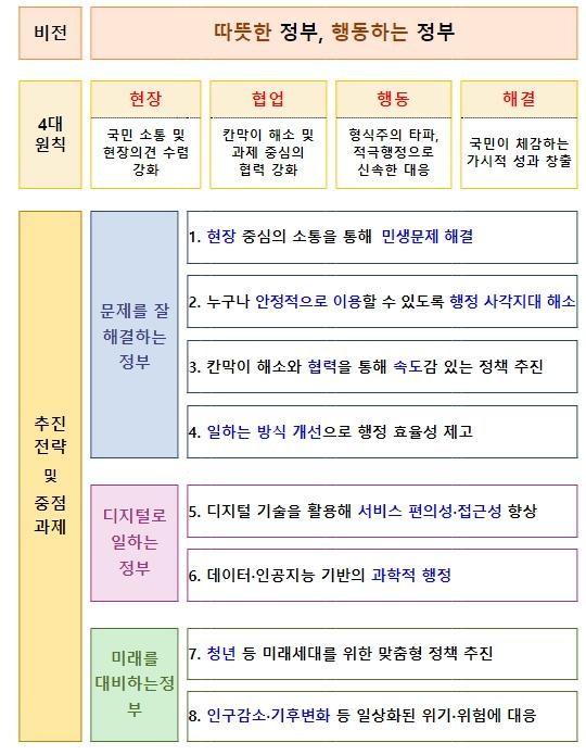 ‘2024년 정부혁신 종합계획’은 최근 민생토론회 등에서 윤석열 대통령이 강조한 정부혁신 방향을 담아 ‘따뜻한 정부, 행동하는 정부’라는 비전과 4대 원칙(현장, 협업, 행동, 해결)을 설정하고 3대 전략, 8개 중점과제에 따라 총 110개의 세부과제를 담았다.