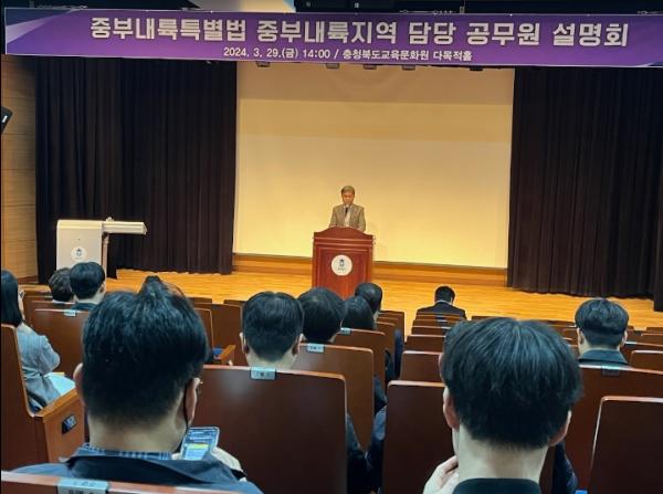 충북도는 지난해 제정된 '중부내륙연계발전지역 지원에 관한 특별법'의 개정방향을 공유하고 의견을 청취 하기 위해 중부내륙특별법 중부내륙지역 공무원 설명회를 29일 충북교육문화원에서 개최했다.