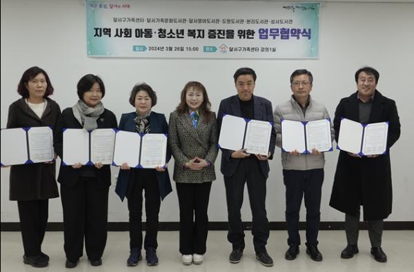 달서구가족센터와 달서구립 5개 도서관(달서가족문화도서관, 달서영어도서관, 도원도서관, 본리도서관, 성서도서관)이 지난 26일 달서구 지역 사회 아동?청소년 복지 증진을 위해 업무협약식을 진행했다.