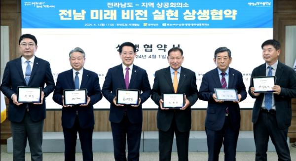 전라남도는 1일 도청 서재필실에서 지역 상공회의소와 함께 국립의과대학 신설, 첨단산업 육성, 육아기 근로시간 단축 등 ‘전남도의 미래비전 실현을 위한 상생협약’을 했다.