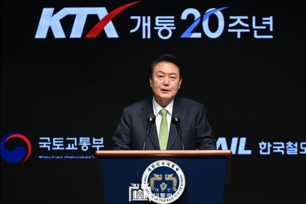 윤석열 대통령은 4월 1일 오전 대전광역시 한국철도공사 본사에서 열린 고속철도 개통 20주년 기념식에 참석했다.