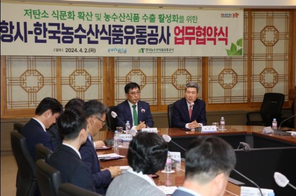 포항시는 2일 한국농수산유통공사와 저탄소 식생활 확대 및 농수축산물 국내 유통 및 수출 확대를 위한 업무협약을 체결했다.