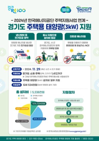 경기도가 정부예산 삭감으로 줄어든 주택태양광 설치 지원사업에 도비 34억 원을 추가 투입한다. 국비 지원이 줄어들면서, 도 단독주택(다가구 포함) 태양광 설치 규모가 감소할 위기였지만 도의 지원으로 설치 규모가 작년보다 소폭 증가하게 됐다.