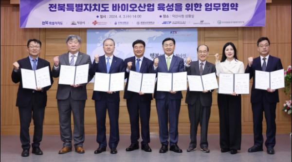 전북특별자치도는 3일 익산시청에서 익산시, 한국썸벧㈜, 전북대학교, 원광대학교, 전북테크노파크, 전북바이오융합산업진흥원과 우호협력을 통한 도내 바이오산업 육성 및 공동발전을 내용으로 하는 ‘바이오산업 육성을 위한 업무협약’을 체결했다.