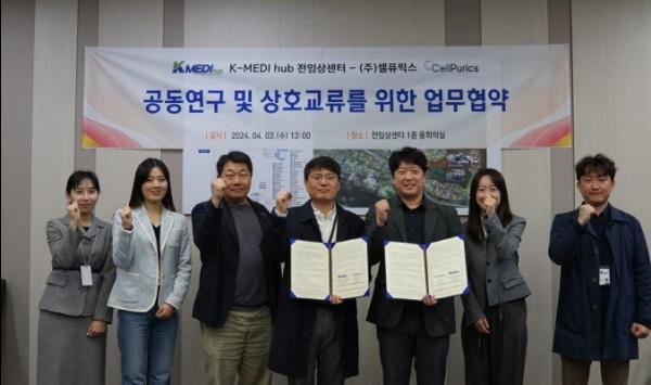 케이메디허브 전임상센터가 지난 3일 ㈜셀퓨릭스와 반려동물용 세포치료제 및 의약품 개발 협력을 위한 업무협약을 체결했다.