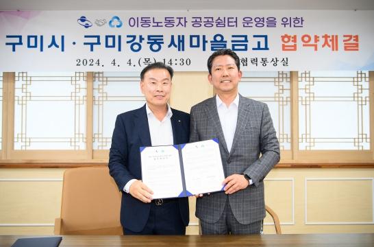 구미시는 4일 시청에서 구미강동새마을금고와 이동 노동자들의 접근성과 편의성을 높이고, 편안한 휴식 공간을 제공하기 위해‘休마루’이동 노동자 공공 쉼터 운영을 위한 업무협약(MOU)을 체결했다.