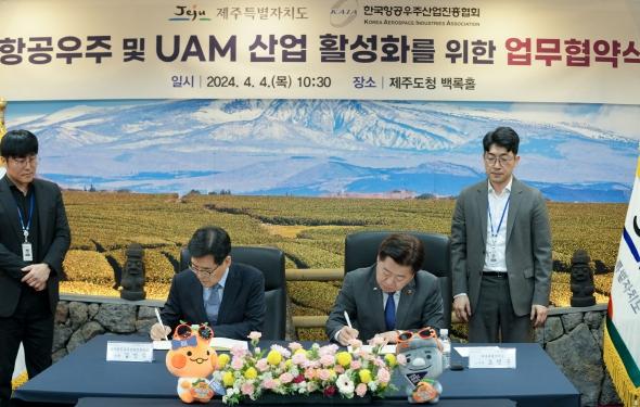 제주도와 한국항공우주산업진흥협회는 4일 오전 10시 30분 제주도청 본관 2층 백록홀에서 ‘항공우주 및 UAM 산업 활성화를 위한 업무협약’을 체결했다.