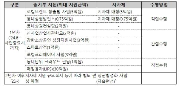 1년차에는 중기부가 공동 상표화(브랜딩), 상품개발 등 지역사업(로컬비즈니스) 확장과 지역 예비소상공인의 창업·혁신 프로그램 운영에 사용할 수 있는 자금 5억원을 지원하고, 2년차에는 지자체가 상권연계 축제기획, 공동상표화(브랜딩) 확장 등 골목산업을 확산할 수 있는 자금 5억원을 지원한다.