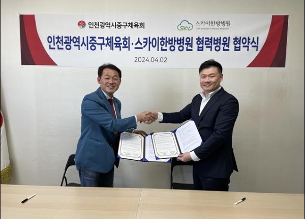 인천광역시중구체육회는 지난 2024년 4월 2일에 스카이한방병원과 지역사회 발전과 다양한 활동을 위하여 업무협약을 체결했다고 밝혔다.