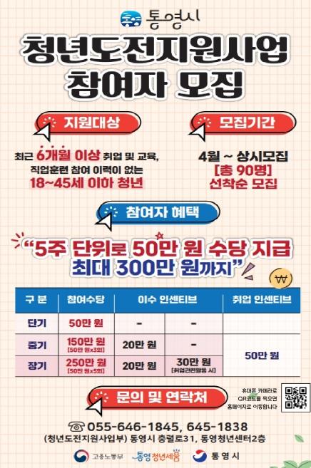통영시는 구직단념청년 등을 대상으로 청년의 구직의욕 고취, 노동시장 참여 및 취업 촉진을 지원하기 위해 ‘2024년 청년도전 지원사업’추진에 따라 참여자 90명을 상시 모집한다.