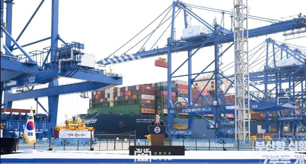대통령은 그간 부산항이 세계 7위의 수출입 항만이자 세계 2위의 환적항만으로 대한민국의 수출 경제를 이끌어왔으나 친환경 선대, 녹색 해운항로 확대 요구 등 우리 앞에 또 다른 변화와 도전이 기다리고 있어 부산항의 경쟁력을 지금보다 훨씬 더 키워야 한다고 말했다.