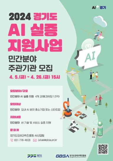 경기도는 인공지능(AI)을 활용한 서비스 모델, 산업 제품 발굴을 위해 '2024년 경기도 인공지능(AI) 실증 지원사업' 민간분야 참여기업을 오는 26일까지 모집한다.