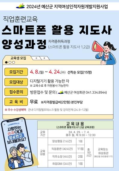 예산군 여성회관은 4월 8일부터 26일까지 3주간 취업을 희망하는 여성을 대상으로 ‘스마트폰활용지도사 양성과정’ 직업훈련 교육생을 모집한다.