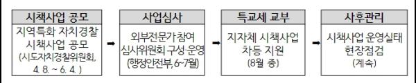 행안부는 대학교수, 연구원, 기업가 등 현장경험이 있는 시책사업 전문가로 사업선정 심사위원회(5인 내외)를 구성해 서면심사(6월)와 현장심사(7월)를 실시하고, 최종 선정된 지자체에는 8월 중 특교세를 지원할 예정이다.
