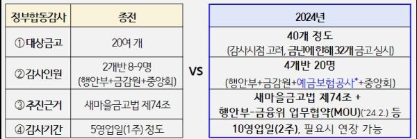 이번 합동감사는 지난 2월 행정안전부-금융위원회가 체결한 ‘새마을금고 건전성 강화 협력체계 강화를 위한 업무협약’의 후속조치로,행정안전부-금융감독원-예금보험공사-새마을금고중앙회가 협업하여 실시하는 정부합동감사로, 대상금고(20개→40개), 감사인원(8~9명→20명), 감사기간(1주, 5영업일 → 2주, 10영업일) 확대 등을 통해 지역금고에 대한 감사를 대폭 강화한다는 점에서 그 의미가 크다.