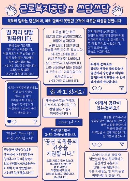 또 수집된 의견 중 약 28.3%는 업무를 처리한 공단 직원에게 전하는 고객의 감사인사로 나타났다. 한 고객은 “저희는 청각장애인인데, 정성껏 메모지를 적어 소통을 해주셨습니다.”라며 감동을 표현했으며, 한국어가 서툰 외국인 고객도 자국어로 진심 어린 감사인사를 남겨 눈길을 끌었다. 공단은 마음이 따뜻해지는 고객의 칭찬 글을 모아 공단이 보유한 온?오프라인 매체를 통해 공유하는 “쓰담쓰담 캠페인”을 펼쳐 직원의 자긍심을 높이고 고객 중심 조직문화를 확산할 예정이다.