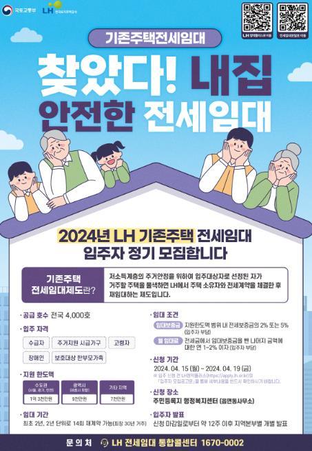 기존주택 전세 임대는 입주대상자로 선정된 자가 거주할 주택을 물색하면 LH에서 주택 소유자와 전세 계약을 체결한 후 재임대하는 주택으로 이번 모집에서는 입주 대상자 30호, 예비자 60호를 선정해 전용면적 85㎡ 이하의 주택을 공급할 예정이다.