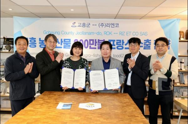 고흥군은 공영민 군수를 단장으로 한 ‘고흥 농수산물 수출개척단’이 지난 4월 6일 프랑스 파리 현지에서 ㈜리엔코와 고흥 농수산물 가공품 200만 불 수출협약을 체결했다고 밝혔다.