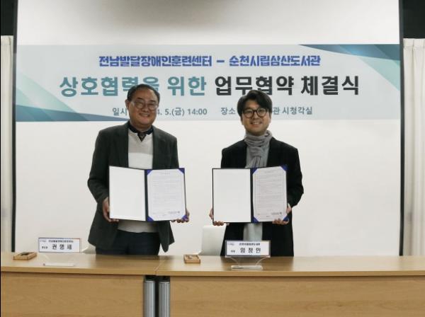 순천시는 지난 5일 순천시립삼산도서관에서 발달장애인의 독서활동과 사서 교육훈련을 위해 전남발달장애인훈련센터와 업무협약을 체결했다고 밝혔다.