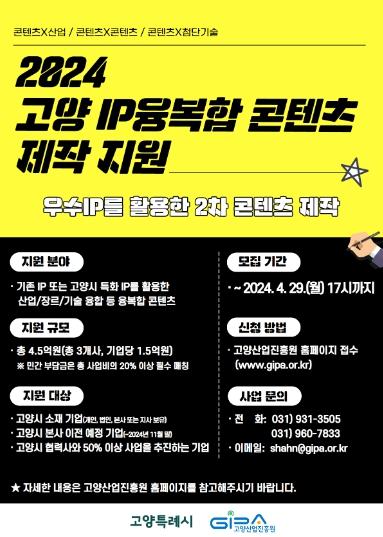 고양특례시와 고양산업진흥원은 4월 29일까지 ‘고양 IP융복합 콘텐츠 제작 지원사업’ 참여기업을 모집한다.