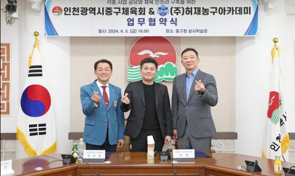 인천광역시중구체육회는 지난 2024년 4월 5일에 인천광역시 허재농구아카데미와 양 단체의 상호 발전 및 각종 사업 공유와 인프라 구축을 위하여 업무 협약을 체결했다고 밝혔다.