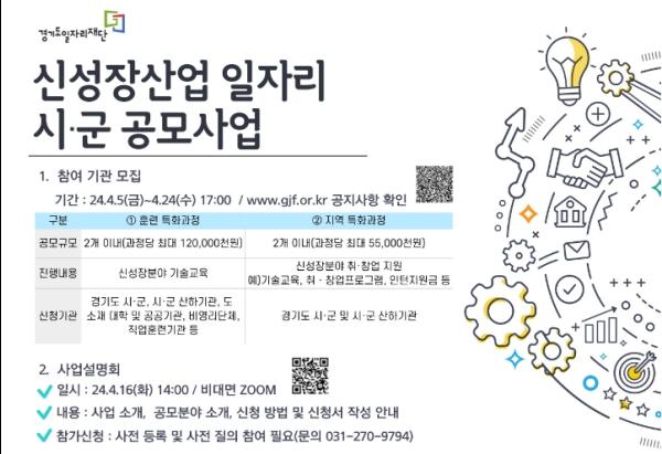 경기도일자리재단이 오는 24일까지 경기도 미래 먹거리인 신성장산업 직업훈련 및 취업지원 사업을 수행할 직업훈련교육 기관 및 시군 공모에 나선다.