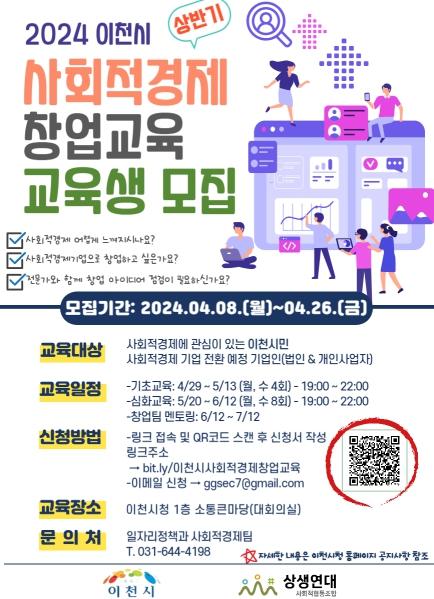 이천시가 사회적 경제조직에 관심있는 예비창업자들을 위하여 “2024 사회적 경제 창업교육” 을 운영한다.