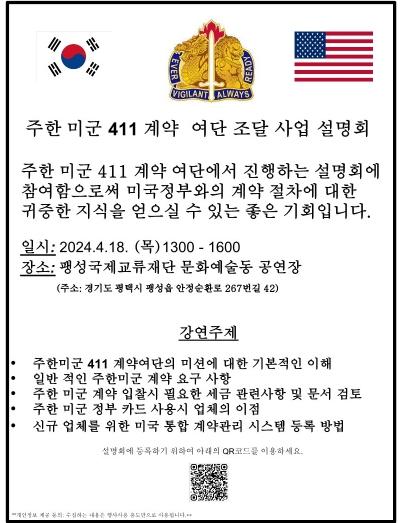 설명회 참여를 희망하는 기업은 ‘주한미군 411계약지원여단 조달 사업 설명회’ 초청장에 있는 QR코드를 이용해 사전 등록할 수 있다.