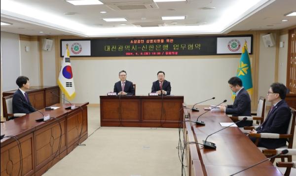 대전시와 신한은행은 9일 대전시청 중회의실에서 이장우 대전시장과 정상혁 신한은행장이 참석한 가운데 신한은행‘땡겨요’배달앱을 활용한 ‘소상공인 상생지원 업무협약’을 체결했다.