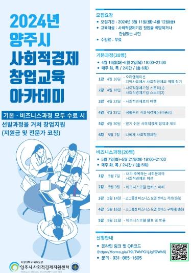 신청기간은 12일까지로 교육참여를 희망하는 경우 양주시사회적경제지원센터 홈페이지에서 공고문을 확인하여 온라인링크 또는 QR코드를 통해 신청이 가능하다.