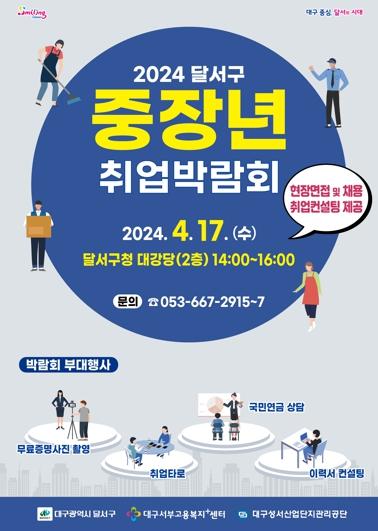 대구 달서구는 오는 17일 오후 2시부터 4시까지 구청 2층 대강당에서'2024년 중장년 취업박람회'를 개최한다.