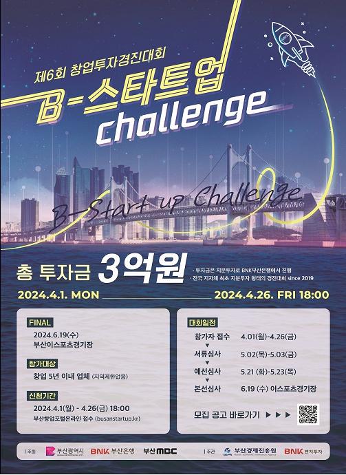 부산시는 오는 6월 19일 '비(B)-스타트업 챌린지(창업투자경진대회)'를 부산 이(e)스포츠 경기장에서 개최한다고 밝혔다.