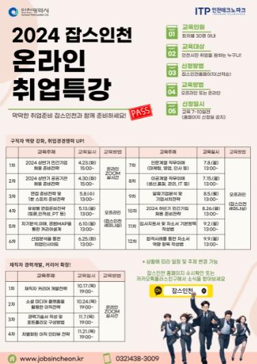 인천테크노파크(인천TP)는 남동구 구월동에 위치한 일자리 카페 ‘잡스인천’에서 오는 11월까지 온·오프라인 취업특강을 운영한다고 11일 밝혔다.