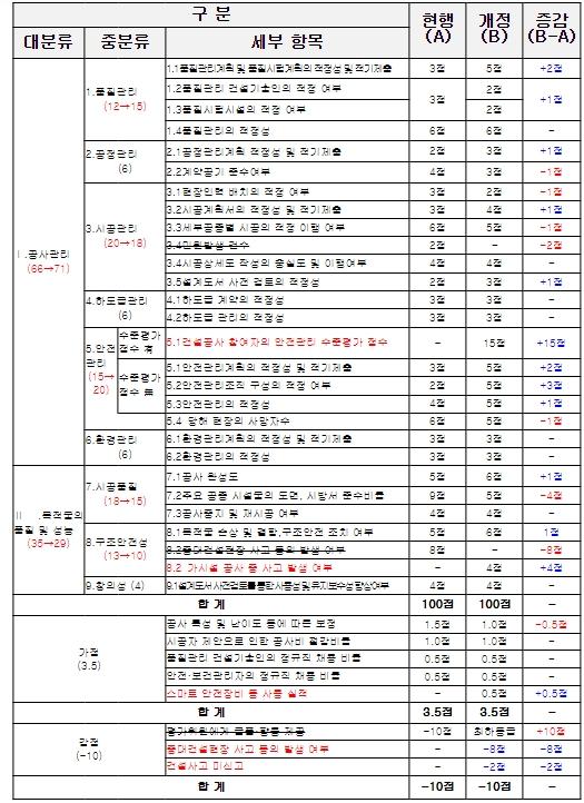 안전관리 배점은 15점에서 20점, 품질관리 배점은 12점에서 15점 상향하고 건설업자가 안전관리 수준평가를 받았을 경우 안전관리 일부항목(15점)을 안전관리 수준평가 점수로 대체한다.