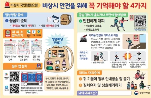 행안부는 매년 “비상시 대국민 행동요령”을 안보상황에 맞게 수정?보완하여 안내책자, 동영상 등 홍보물을 제작?배포(송출)하고 있다.