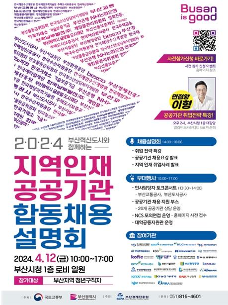 부산시는 오늘(12일) 오후 2시 시청 대강당에서 '부산혁신도시와 함께하는 '2024 지역인재 공공기관 합동채용설명회''를 개최한다고 밝혔다.