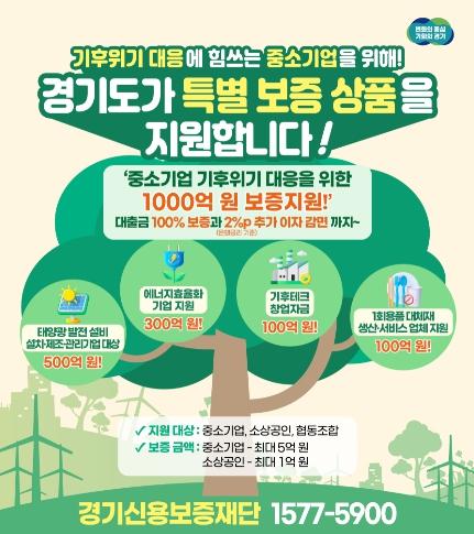경기도는 기후위기 대응을 위한 1천억 보증지원금을 ▲태양광 기업에 500억 원 ▲에너지효율화 참여기업에 300억 원 ▲1회용품 대체제 생산기업에 100억 원 ▲기후테크 기업에 100억 원을 각각 지원한다.