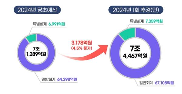이에 따라 충청북도의 올해 총 예산규모는 7조 4,467억원(일반회계 6조 7,108억원, 특별회계 7,359억원)으로 기정예산 7조 1,289억원 보다 4.5% 증가했다.