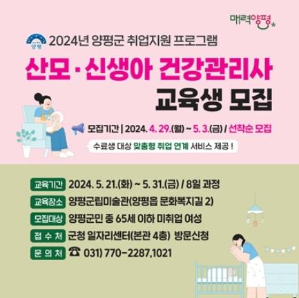 양평군은 2024년 취업지원 프로그램인 ‘산모·신생아 건강관리사’ 교육생을 오는 29일부터 모집한다고 밝혔다.