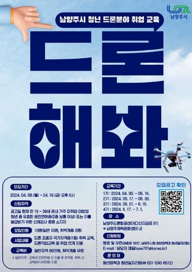 남양주시는 미래 유망 산업인 드론 전문가 양성과 취업 지원을 위한 ‘남양주시 청년 드론분야 취업 교육 과정’참여자를 오는 19일까지 모집한다고 밝혔다.