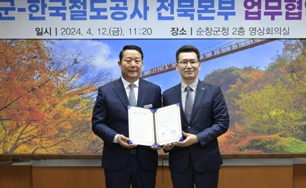 순창군은 12일 한국철도공사 전북본부와 상생협력 업무협약을 맺고 지역사회 발전 및 철도관광 활성화를 위하여 두 손을 잡았다고 밝혔다.