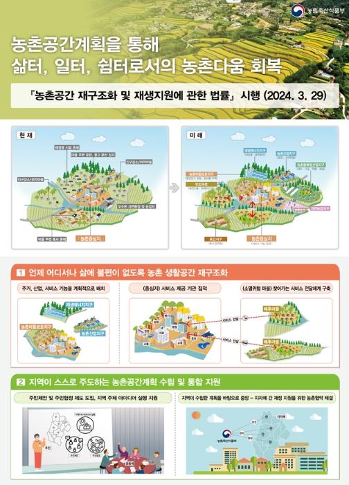 농림축산식품부는 농촌소멸 위기와 난개발 등에 대응하고, 삶터·일터·쉼터로서의 농촌 기능 재생을 위한 ‘농촌공간 재구조화 및 재생 기본방침’을 발표했다.