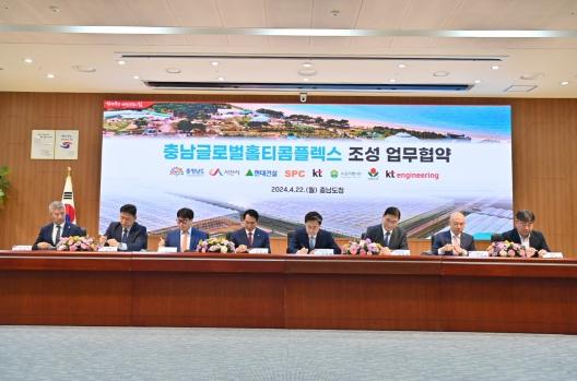 김태흠 지사는 22일 도청 대회의실에서 이완섭 서산시장, 윤영준 현대건설 대표이사, 성제현 KT 본부장, 유창규 KT엔지니어링 부문장, 장승호 에이앤오제일차 대표, 윤동률 우듬지팜 대표이사, 정순태 그린플러스 대표 등과 충남글로벌홀티콤플렉스 조성 양해각서를 체결했다.