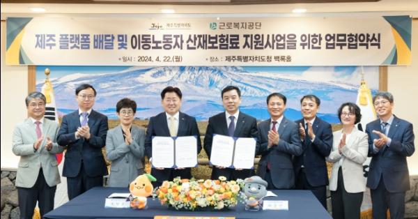 제주도와 근로복지공단은 22일 제주도청 백록홀에서 ‘제주 플랫폼 배달 및 이동노동자 산재보험료 지원사업 업무협약’을 체결했다.