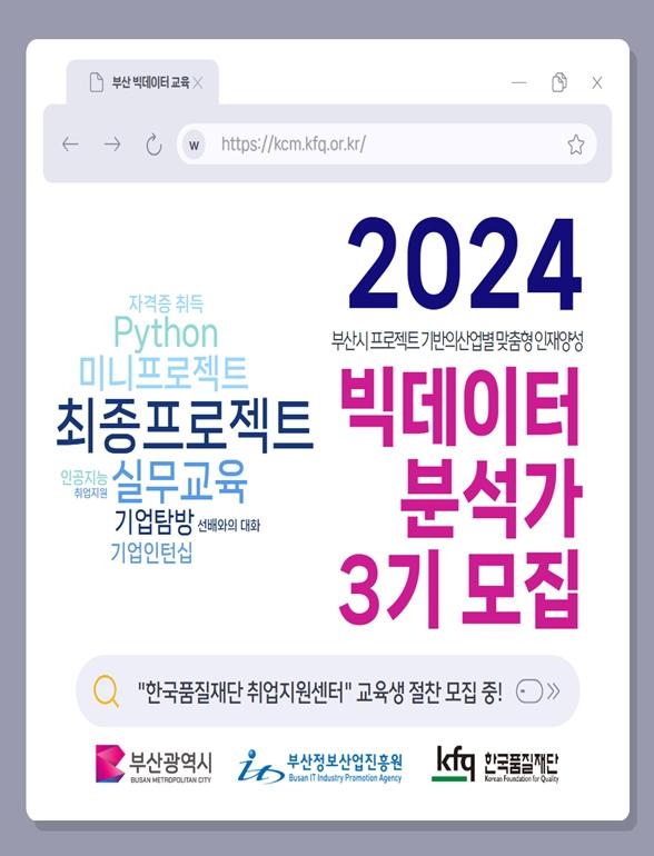 부산시는 지역에 필요한 실무형 빅데이터 분석가 양성을 위한 '2024년 프로젝트 기반의 산업별 맞춤형 인재양성 사업'에 참여할 교육생을 모집한다고 밝혔다.