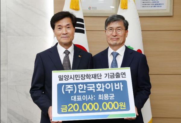 (재)밀양시민장학재단은 지난 22일 시청 시장실에서 첨단 복합소재 전문기업인 ㈜한국화이바가 지역 인재 육성을 위한 장학금 2,000만원을 기탁했다고 밝혔다.