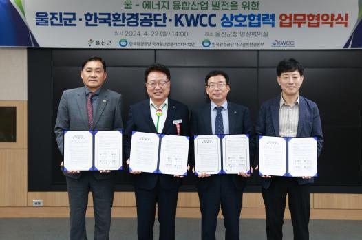 울진군은 지난 22일 울진군청 영상회의실에서 한국환경공단 국가물산업클러스터사업단, 한국환경공단 대구경북환경본부 그리고 국가물산업클러스터 입주기업협의회와‘물-에너지 융합산업 발전을 위한 업무협약’을 체결했다.
