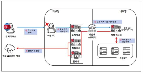 북한 해킹조직은 2022년 11월부터 ‘가’ 방산업체 외부망 서버를 해킹하여 악성코드에 감염시킨 후 테스트 목적으로 열려있는 망 연계 시스템의 포트를 통해 회사 내부망까지 장악했다. 개발팀 직원 컴퓨터 등 내부망의 중요자료를 수집하여 국외 클라우드 서버로 자료를 빼돌렸다.